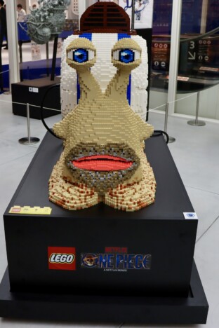 エントランスを出て店内を進むとフィギュアやポスターなどの売り場が登場。イラストや貴重な盾が並ぶ中、印象的なのはLEGOで作られた”電伝虫”のオブジェ。今にも喋り出しそうなリアルなビジュアルとなっている。