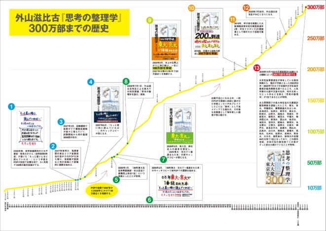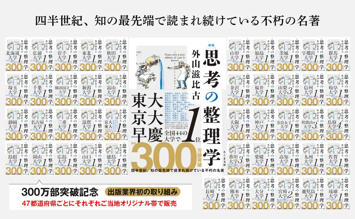 このブレイクによって2008年の東大生協本郷書籍部・京大生協の書籍販売ランキングで1位を獲得、“東大・京大で1番読まれた本”のフレーズが生まれました。このフレーズを帯で使用したことをきっかけに2度目のブレイクが起き、2009年に累計発行部数が100万部を突破。その後も毎年新たな読者を増やし続け2016年に200万部、2020年に250万部を突破した。2024年には「東大特別講義」を増補して初の改訂を実施し、新版に。今年2025年10月に300万部に到達し、これまで“東大・京大で1番読まれた本”のフレーズで知られてきた本書は、11月より300万部突破記念として47都道府県の書店ごとに地元大学名と文庫ランキング集計結果を記したオリジナル帯を付けての販売が開始されると週売がそれまでの約13.5倍に上昇、3度目のブレイクともいえる爆発的な売れ行きとなっている。