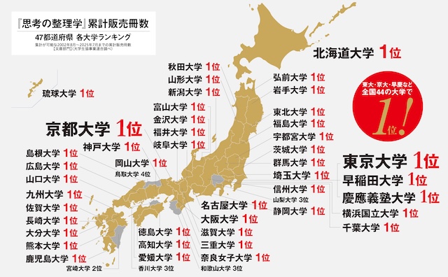 大学生協事業連合が保有していた販売実績によれば、集計が可能となった2002年8月から2025年7月までの各大学生協での文庫累計販売冊数で、東大、京大、早稲田大、慶應義塾大をはじめ全国44の大学で『思考の整理学』が1位であったことがわかった。300万部突破記念として47都道府県ごとにご当地大学名の帯で販売が開始された。11月23日にはNHK「おはよう日本」で特集されたこともあって注目を集め、“Billboard JAPAN Showa Books”の2025年11月27日公開分(集計期間:2025年11月17日~11月23日)で1位を獲得するなど好調な売れ行きとなっている。