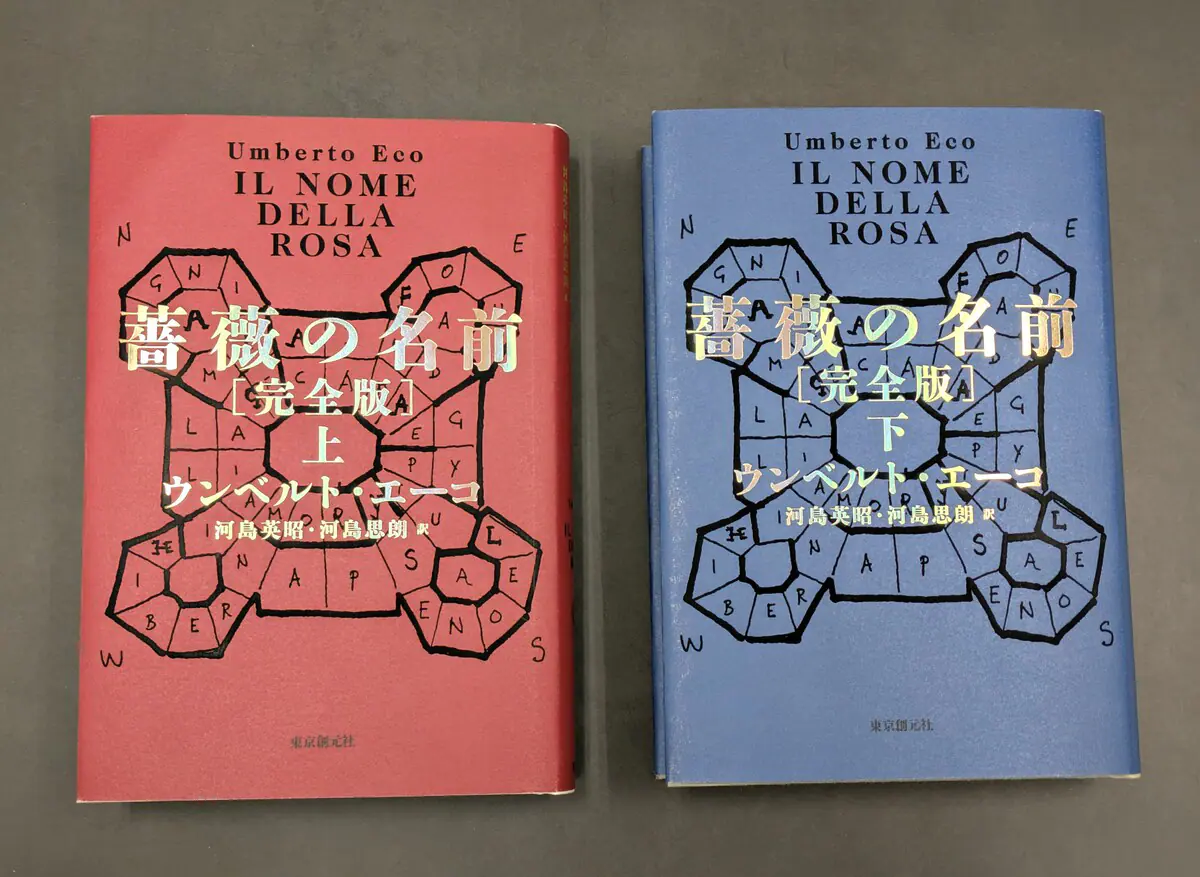 上巻を赤、下巻を青とし、カバーの中心に物語の核となる「文書館」(エーコ本人が描いたイラストを使用)を据え、箔押しで作品タイトルをあしらった、重厚感あふれる装丁で発売される『薔薇の名前』。初回出荷分限定でお届けする、特別カラーの箔押しカバーが発表された。