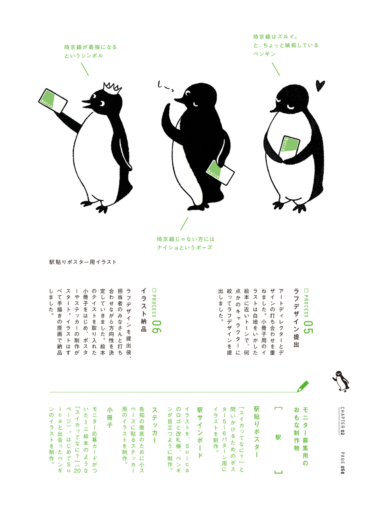 また、坂崎はキャラクターをふちどる線にもこだわる。『イラストのこと』での紹介によれば、〈ブルブル線〉〈完全ブルブル線〉〈ベジェ曲線〉の3つの線を坂崎は使い分けているのだ。Suicaのペンギンは〈ブルブル線〉、すなわち〈手描き感をいかした、均一で小刻みなブルブルともギザギザとも見える線〉で描かれている。線によって与えられた〈手描き感〉が、Suicaペンギンのあの親しみやすさと関係しているのかもしれない。