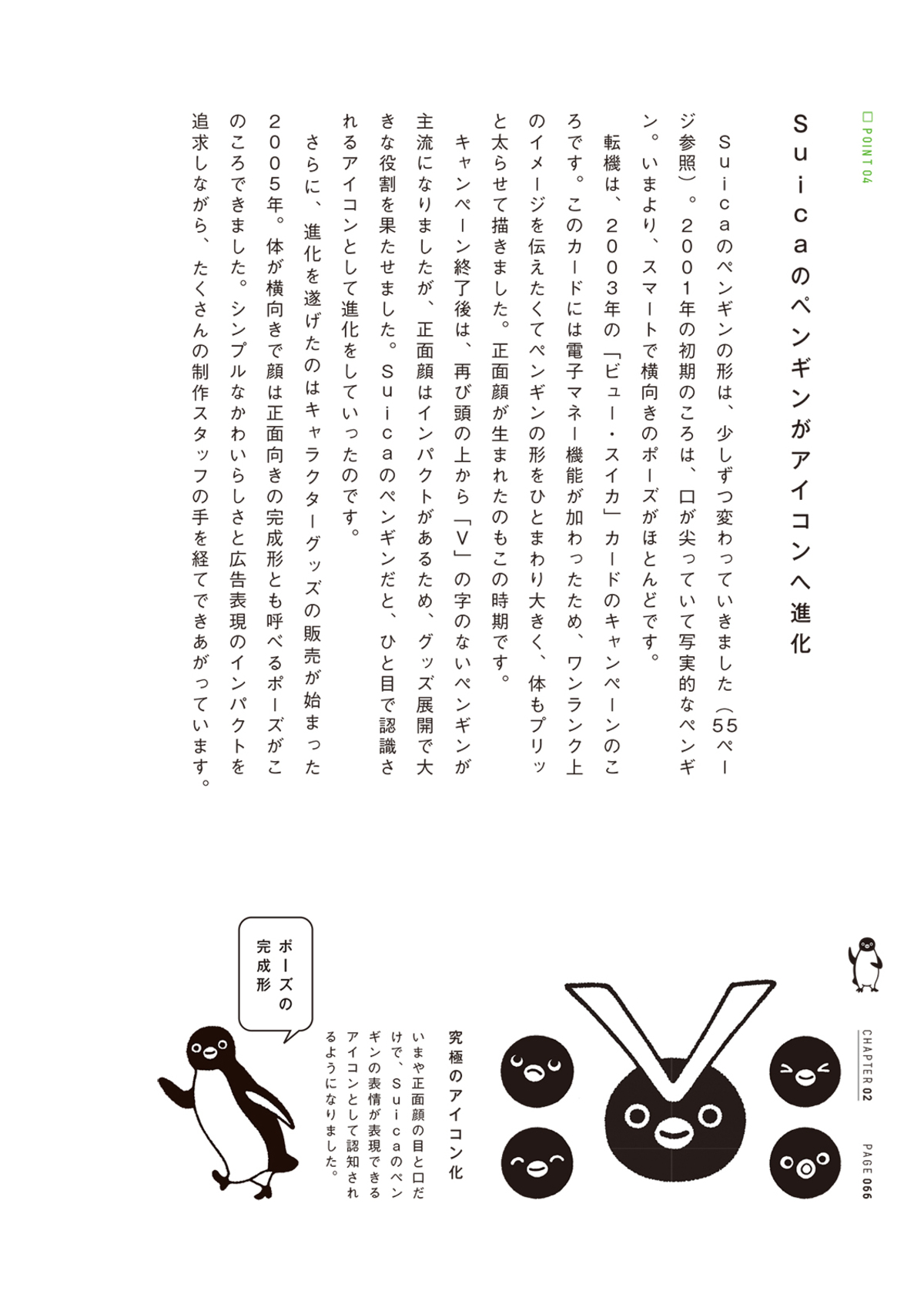 初期はスマートだったSuicaペンギンに転機が訪れたのは2003年。「ビュー・スイカ」カードのキャンペーンで、頭に黄色いVの字をのせたペンギンを登場させた際に、いまの正面の向いた丸っこい顔が生まれた。その後、頭からVの字をふたたび外したあとも正面を向いた顔は使われつづけ、2005年に「顔は正面向き、体は横向き、そして右手(翼)をこちらに上げている」といういまのSuicaにも使われているポーズが完成したそうだ。