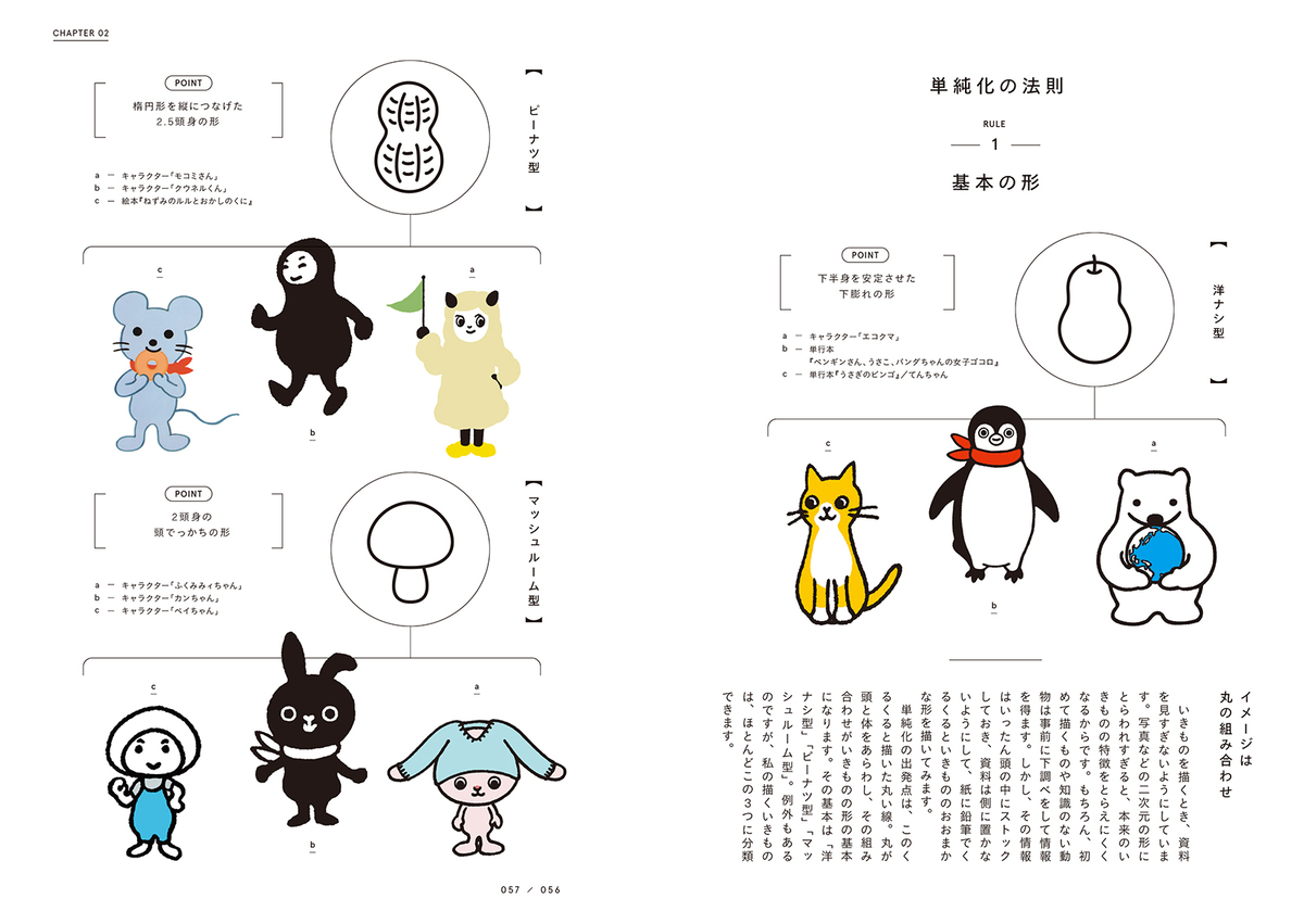 坂崎は、『いきものとイラスト』で〈いきものを描くとき、資料を見すぎないようにしています〉と語っている。本来の姿にとらわれすぎず、丸っこいかたちを基本とした「単純化」によってかわいらしい動物キャラクターの数々が生まれているのだ。そんな「単純化」には3つのパターンがある。〈洋ナシ型〉〈ピーナツ型〉〈マッシュルーム型〉である。Suicaのペンギンは〈洋ナシ型〉にあたる。