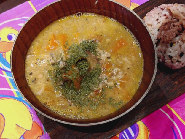 3日目・鶏とレタスの水炊き この日の朝食は新たに炊き足した雑穀ごはんに、昨日たくさん作っておいた「なすのトマト蒸し煮」を乗っけて小丼にした。昼食は出先で焼き魚定食を注文した。