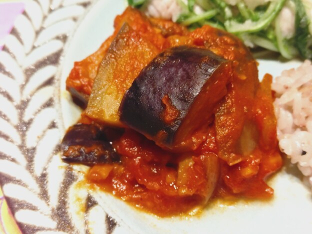 2品目、「なすのトマト蒸し煮」。 作り方:一口大に切ったなす、1cm角に切ったズッキーニ、玉ねぎセロリ、潰したにんにくを鍋に入れ、ローリエ・オレガノ・タイム・トマトジュース・トマトペースト・塩を合わせてよく混ぜる。蓋をして中火にかけ、煮立ったら少し火を弱くする。時々混ぜ、野菜がくたっとしてきて、ほとんど水気がなくなるまで30~40分煮る。