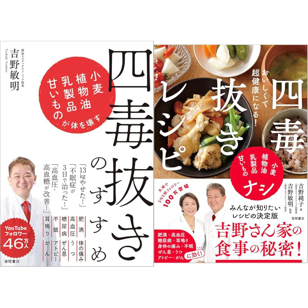 「四毒抜き」……これは銀座エルディアクリニック院長の吉野敏明さんが著書の中で提唱し大きな話題となった食事法。日本人が長い歴史の中で食べてこなかった4つの食べ物をなるべく排除するのだという。本書は吉野敏明さんの妻であり、銀座エルディアクリニック副院長の吉野純子さんによる「四毒抜き」メニューのレシピ本だ。ちなみに「四毒」の内訳は、小麦・植物油・乳製品・甘いものである。