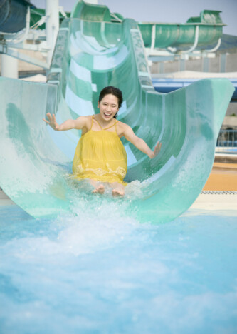 野中:市民プールでワンピースの水着を着て、ウォータースライダーに乗っている写真が2枚使われています。プール開きの前に貸し切りのような状況だったのですが、どうしてもウォータースライダーに乗りたくて、「良い笑顔で滑りますから!」と無理を言って撮影させていただきました。職員のみなさんがわざわざきれいな水を大量に流して下さり、感激しましたね。