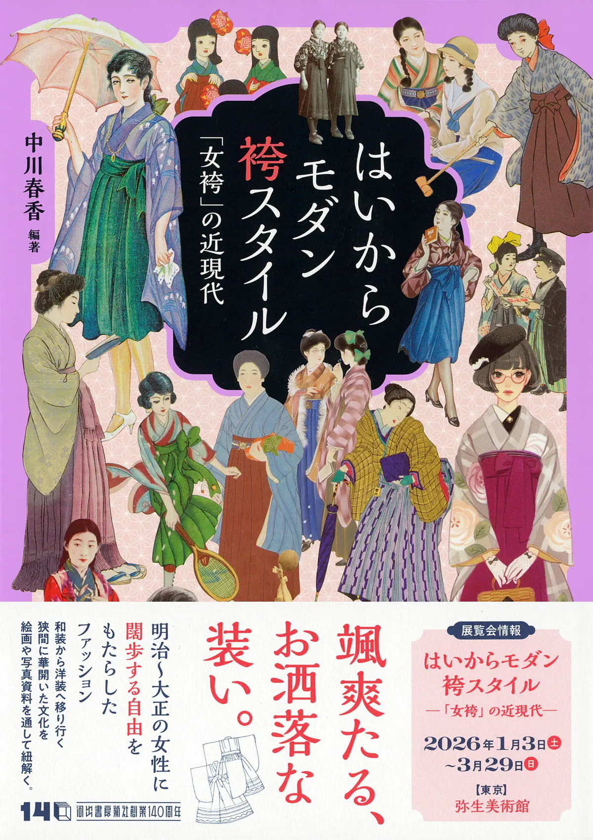 女学生、職業婦人、タカラジェンヌ――明治・大正・昭和を駆け抜けた女性たちの”闊歩”を可能にした新ファッション「女袴」を特集。政治やメディア批判に翻弄された男袴から女袴への変遷、女袴の普及によって可能になったアクティヴィティに励む女学生の笑顔、画家たちが描いた少女像まで、写真も絵画も紹介。各女学校の袴の歴史や、宝塚音楽学校・宝塚歌劇団の黒紋付×緑袴の秘密も徹底解剖。2026年1月3日からは、弥生美術館で展覧会「はいからモダン袴スタイル―「女袴」の近現代―」が開催される。