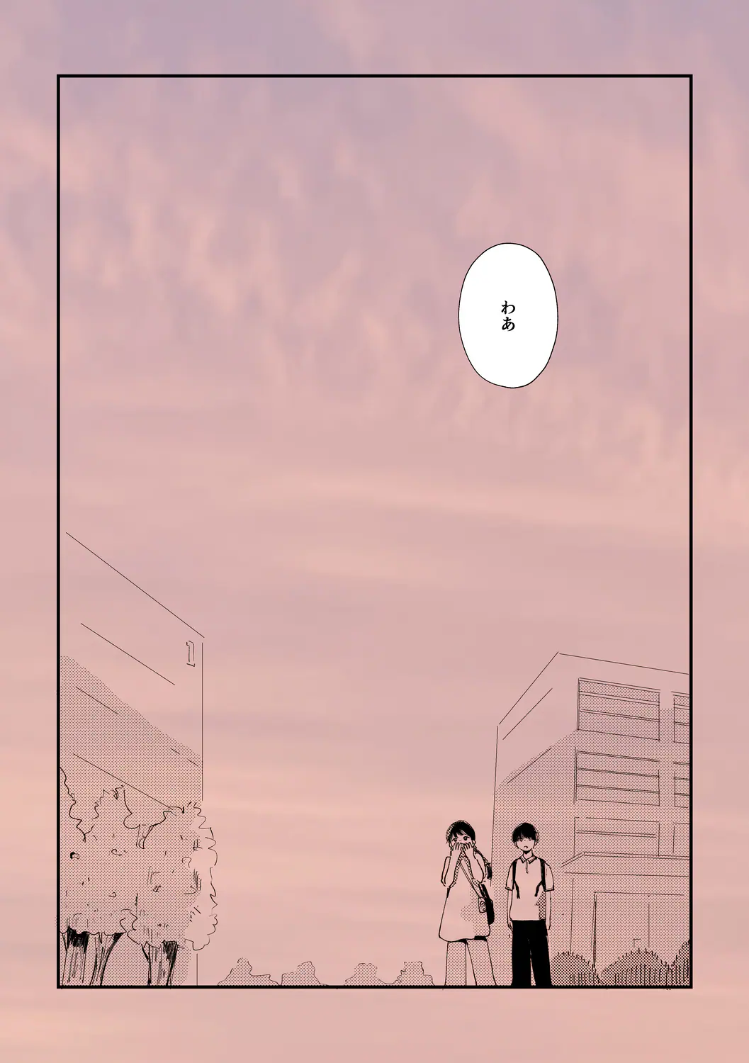 春実ぽぽこ(以下、春実):きっかけは台風の日にピンク色に染まった風景を実際に見たことです。現実の世界じゃないみたいで「不思議だなー、『エモい』みたいだなー」とひとりで思うだけでしたが、もし誰かといたらその景色を共有できて、それで通じ合えたら嬉しいし、恋とか愛とか難しいことを考えずに「好きだー」という気持ちが溢れるなと思って描きました。