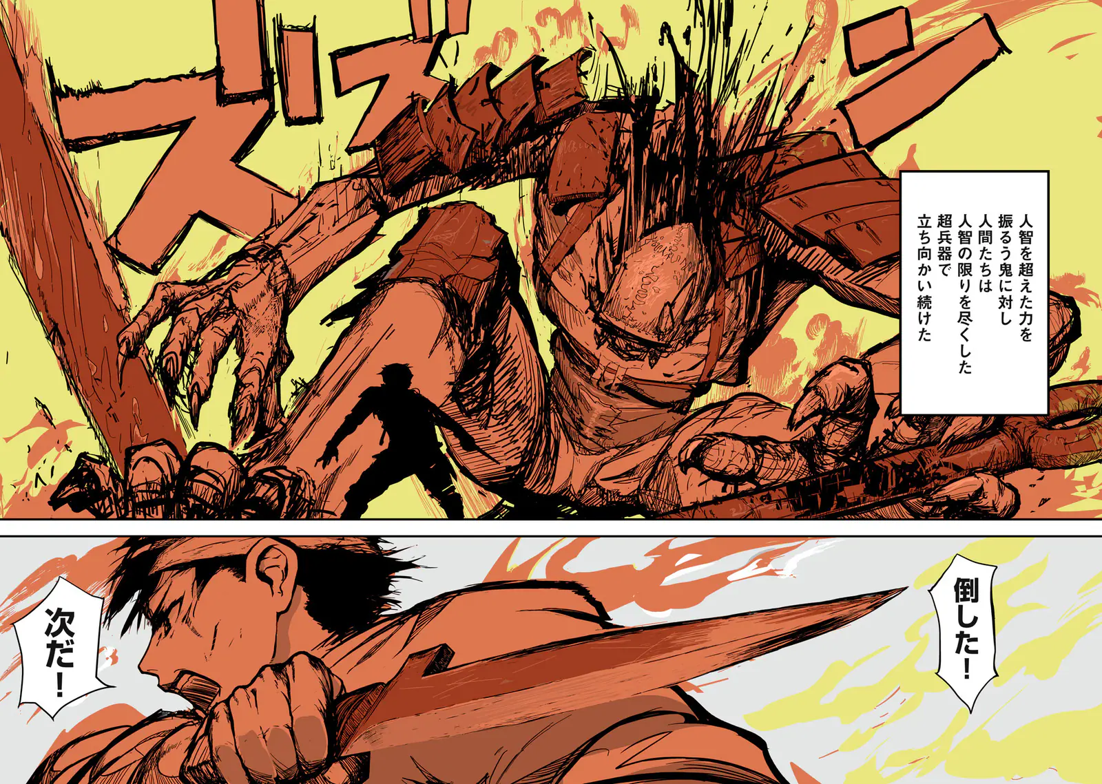 東:戦局をリセットしてしまうほどの究極の兵器は何か、と考えたときに普通の爆弾とかじゃダメなんです。一振りで鬼軍勢の下半身を両断するわけですが、その前段階として服を切って鬼を半裸にしてしまうんですよ(笑)。コミカルな場面ですけど、この兵器の持つ精密性や隠密性をよく表した場面でもあるんです。