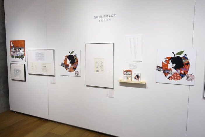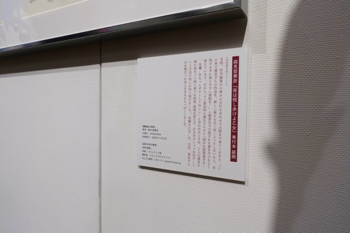 そして展示の中でも最もボリュームがあったのが、『四畳半神話大系』をはじめとする森見登美彦作品の装画。単行本版と文庫版で異なる表紙や、発表媒体に合わせたリファインのプロセスなどが順を追って展示されており、判型や媒体に合わせて細かい調整が行なわれていることがよくわかります。特に中村氏にとっても代表作である文庫版『夜は短し歩けよ乙女』の表紙については、文庫版装画をもとに作られたアニメのキービジュアル、さらに最新の書籍カバー集『READ』(飛鳥新社)の表紙としてリメイクされたバージョンの原画も展示。同一コンセプトのイラストがどう変化してきたのかを追いかけることができます。