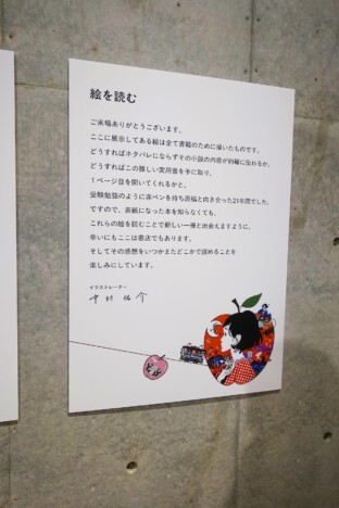 内覧会の挨拶で中村氏は、「これまでにも作品展は数多く開催されてきましたが、その多くではほとんど自作の説明を添えてこなかった」と話します。「見てもらう人に固定観念を与えたくなかった」という理由からあえて説明を排していたという中村氏ですが、今回は本の装画の展示会を書店と連動して開催するということで、今までにないほど解説を充実させたそう。「読んでもらうための展覧会」というコンセプトの通り、この解説だけでも相当に読み応えがあり、さらに解説を読んだ上でそれぞれのイラストを見ることで、新しい発見を楽しむこともできます。