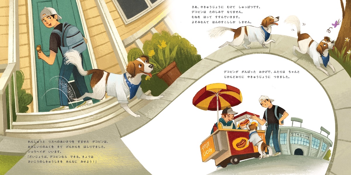 これにはイラストレーターのファニー・リム氏による、そっと触れたくなるようなイラストの力も大きい。ホワイトをベースにオレンジレッド(茶)の斑が入ったデコピンの、ちょっと先のカールした耳の毛先のチャームポイントもバッチリだ。そしてデコピンを取り巻く町や動植物、人々、犬目線ならではの視界も楽しく、その描写の端々から、大谷選手にとってデコピンがいかにかけがえのない存在であるかが伝わってくる。