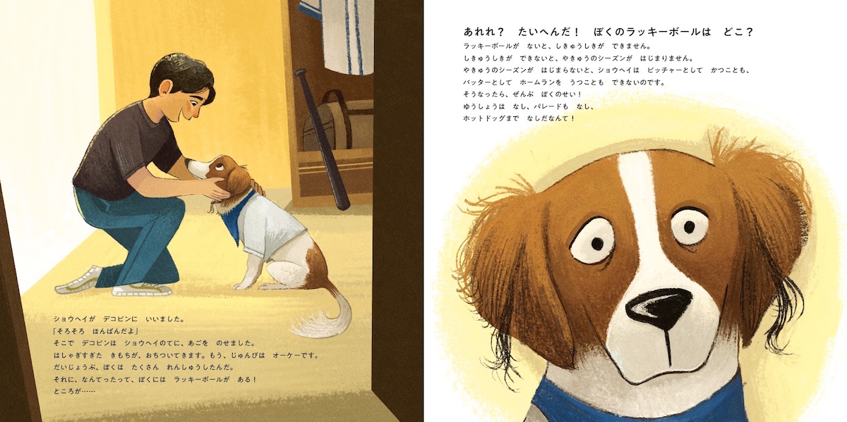 さて本作はいわゆる“大谷選手が手掛けた”という枕詞の強さだけでなく、絵本そのものの魅力でも、高い評価を得ている。中盤、デコピンはピンチに直面。「たいへんだ! ぼくのラッキーボールは どこ?」と、お気に入りのボールを家に忘れたことに気づき、始球式までに“ラッキーボール”をもって野球場に戻るミッションを、ひとりで遂行することになる。「あの始球式の成功を振り返った物語なのだろう」と読み進めていると、“冒険”へと進む流れに、いい意味で裏切られる。そして全力で駆ける姿や、表情の豊かさに引き込まれ、「デコピン、がんばれ!」と応援したくなる。