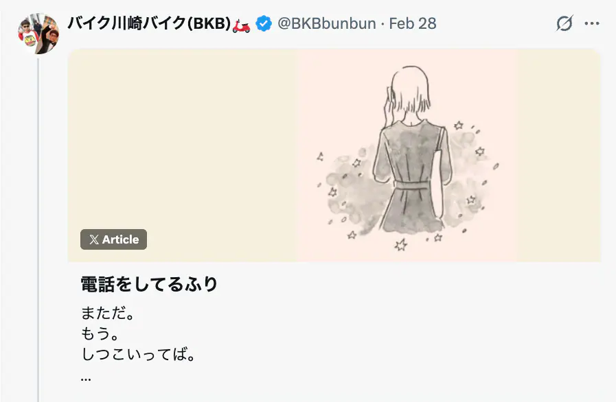 そんな代表作の表題作「電話をしてるふり」を、2月28日に自身のX(@BKBbunbun)で改めて投稿。ナンパされやすい“私”が、父親と電話しているふりをしてその場をやり過ごそうとする——そこから始まる数分で読める物語が、多くの人の涙腺を直撃した。投稿は瞬く間に拡散され、多くの著名人も反応した。