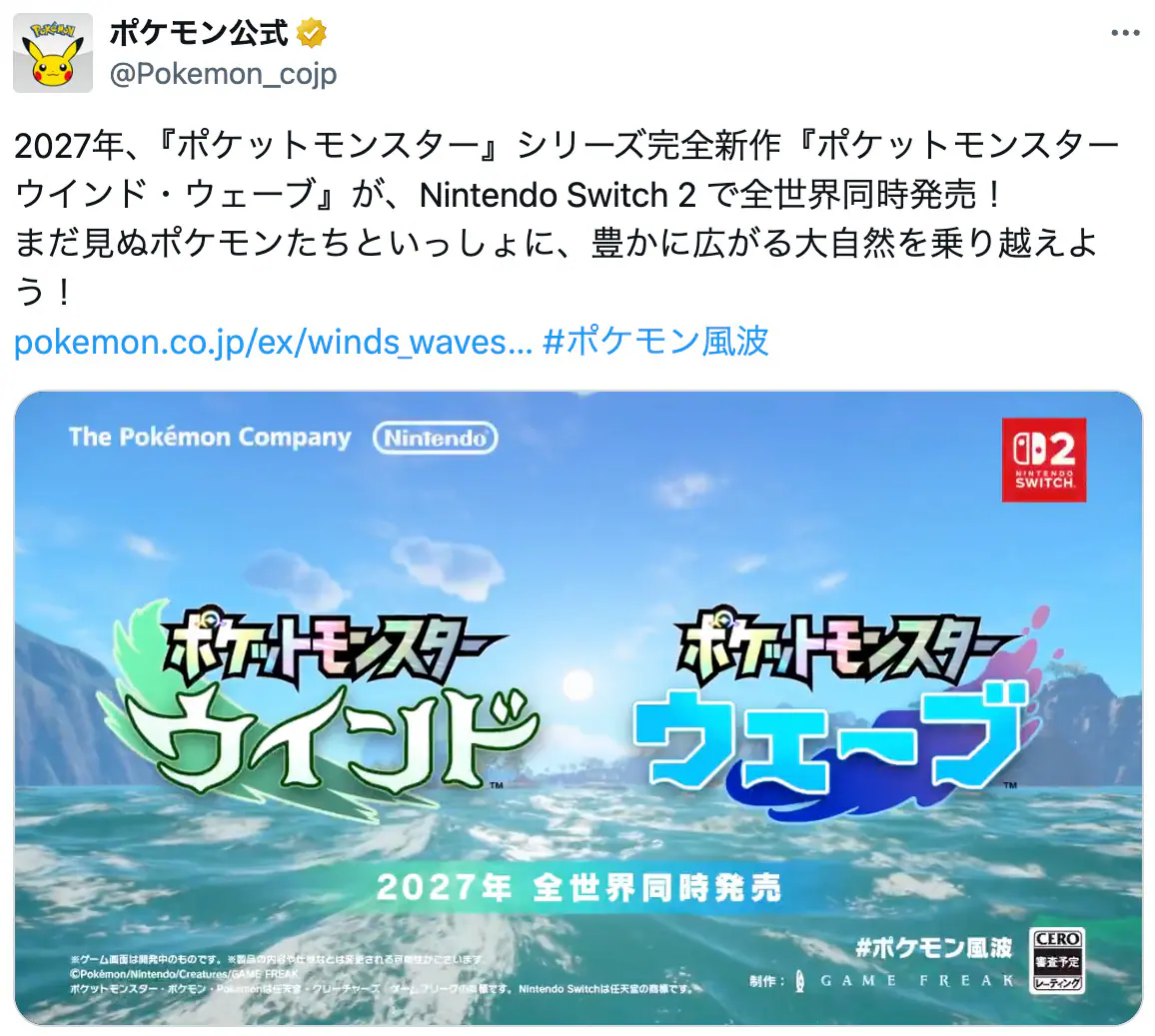 2027年、『ポケットモンスター』シリーズ完全新作『ポケットモンスター ウインド・ウェーブ』が、Nintendo Switch 2 で全世界同時発売!