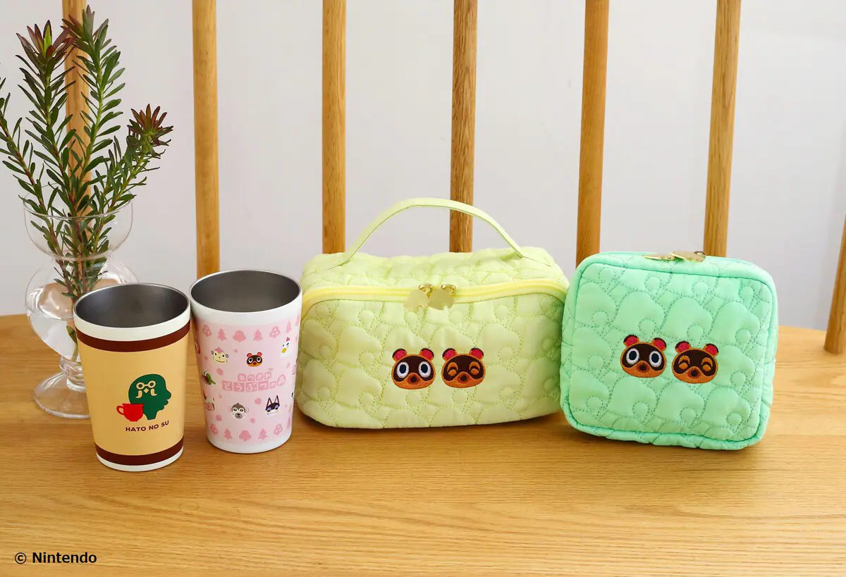 アイテムは、ポーチ2種と真空断熱タンブラー2種の計4種。『あつまれ どうぶつの森』らしい葉っぱ柄のキルティングがポイントの春色カラーのポーチは、まめきち&つぶきちの刺しゅうをあしらい、180度にガバッと開くポーチと日常使いしやすいスクエアポーチの形・色違いで展開。