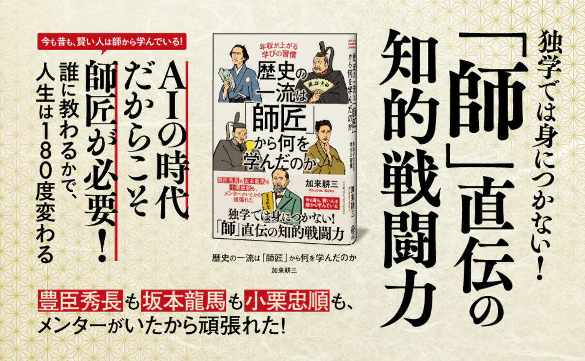 歴史を振り返れば、坂本龍馬は勝海舟から、織田信長は沢彦宗恩から、徳川家康は武田信玄から学び、それぞれが歴史に名を残す偉業を成し遂げた。彼らが師匠から学んだのは、単なる知識や技術だけでなく人としての生き方や判断力であり、AI全盛の現代だからこそ生身の人間である師匠から学ぶことの価値が再評価されているという。