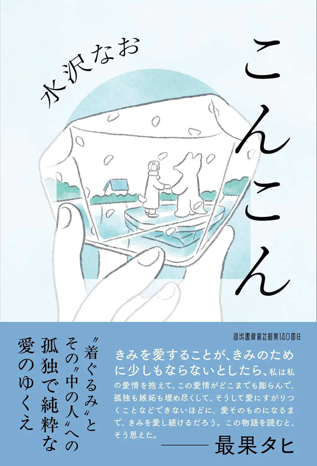 水沢なお『こんこん』(河出書房新社)は、第25回中原中也賞を受賞した『美しいからだよ』(思潮社)他の詩集や短篇集『うみみたいに』(河出書房新社)などの著書がある作者による、繊細な心の物語だ。造本が凝っていて、白いカバーに窓が空いており、表紙の絵が透けて見える。右手で持った結晶の絵である。結晶の中にはコートを着た女性らしい人影と、その前に立つぬいぐるみのような動物の姿が見える。