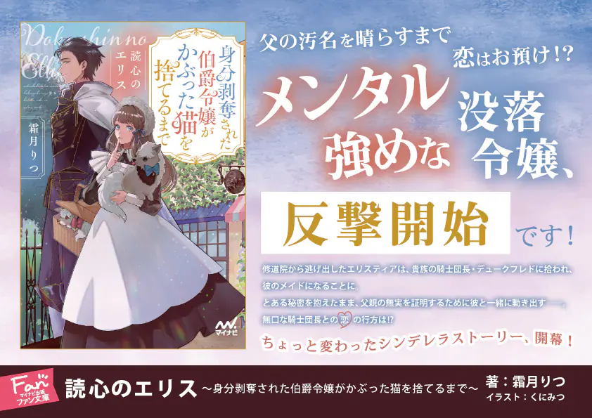 霜月りつの小説『読心のエリス 身分剥奪された伯爵令嬢がかぶった猫を捨てるまで』(マイナビ出版)が2026年2月24日の発売開始より1ヶ月ほどで重版となった。