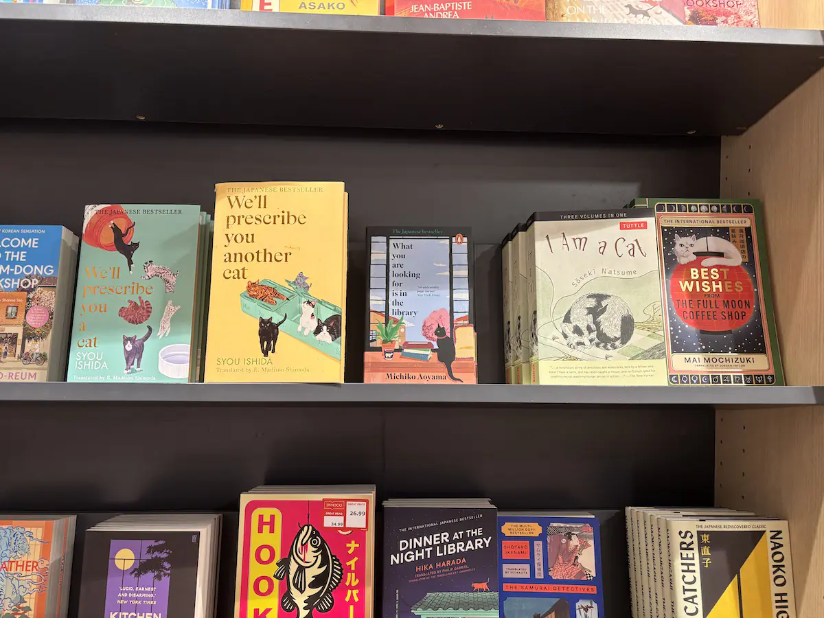 最後に、日本の作品の取り扱いについても紹介したい。Dymocksフラッグシップ店では翻訳書コーナーが設けられており、英語以外の言語から翻訳された小説が並ぶ。英語以外の言語と言いつつ、昨今の日本人作家ブームもあってか、日本を中心としたアジア圏の作品が多い印象だ。望月麻衣の『満月珈琲店の星詠み』や青山美智子の『お探し物は図書室まで』には小さな猫が描かれているが、この特徴的な表紙の2冊はDymocksの他店舗および他の書店でも頻繁に見かける。さらに『BUTTER』で大ヒットした柚木麻子の『ナイルパーチの女子会』は2026年3月に英訳版が刊行され、やはり一番目立つ場所に並んでいる。さらに別のDymocksの店舗では、筆者がかつてインタビューさせて頂いた川代紗生の『元カレごはん埋葬委員会』の翻訳版が翻訳小説の棚ではなく、一般のフィクションの棚に面陳列で置かれており、注目度の高さが窺えた。海を超えた日本の作品との再会は嬉しいものだ。(「元カレが好きだったバターチキンカレー」考案者・川代紗生に聞く、復讐心を埋葬する方法)