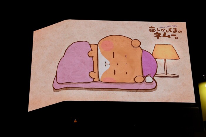 柔らかなタッチで描かれた愛らしいビジュアルと、すべての人の心に寄り添う優しい言葉で、SNSを中心に注目を集めている『夜ふかしくまのネムー。』。なんだかモヤモヤして寝つけない“ネムー(くま)”と、それに寄り添う“ひつじ”が送る、“心のお薬”のようなお話だ。そんなネムーが、現在池袋駅前にある大型デジタルサイネージに登場中。SNSからリアルの世界に飛び出し、夜の街で人々の心を癒している。本記事では、現場の模様をレポートする。