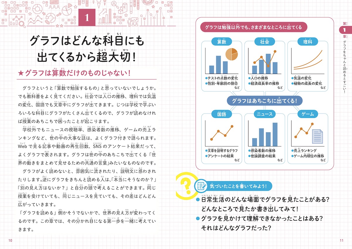 特にこの1、2年は生成AIに関する本も一気に増えて、小学生のうちから自然に触れている子どもも珍しくなくなりました。でも、生成AIの回答は当然ながらすべてが正しいわけではない。出てきた情報をそのまま受け取るのではなく、自分で確かめ、読み解く力のベースとしても、「グラフの読み方」は大事なテーマだと思いました。