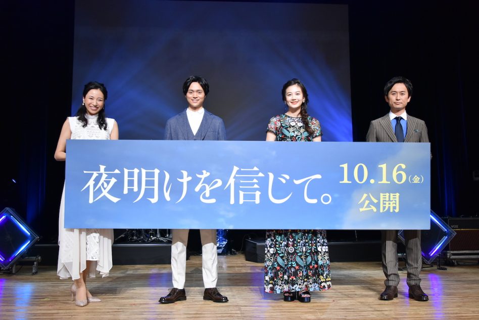 10月16日公開の映画『夜明けを信じて。』のトーク&ライブイベントが、大井町きゅりあん大ホールにて開催され、田中宏明、千眼美子、長谷川奈央、本作の総合プロデューサーを務めた竹内久顕が登壇した。