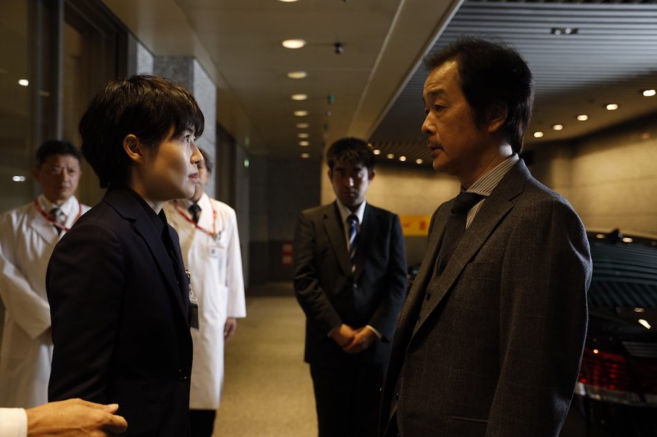 白鳥が所属する「東帝大学病院」と言えば、同じく中園ミホ脚本の人気作『ドクターX~外科医・大門未知子~』(テレビ朝日系、以後『ドクターX』)シリーズの舞台となった大病院だ。『ドクターX』では旧態依然とした大病院に一矢報いる側にいるフリーランス外科医・大門未知子(米倉涼子)の派遣元である名医紹介所所長・神原晶役を演じた岸部一徳が、本作ではどっぷり体制側にいる財務大臣の粟田口十三役として、正反対の立場からあの決め台詞を放つ。「“私、失敗せえへんさかい”って言うスーパードクターや」と、大門の決まり文句を用いて白鳥のことを紹介するパロディーぶりに沸き立ったファンも多かったのではないだろうか(ちなみに、室井滋は彼とは反対に、『ドクターX』では体制側である大病院の事務長、本作では反体制側で秘書たちと共に暗躍する鰐淵五月役を演じている)。