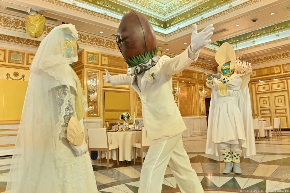 ラグビー邪面は、初の邪面師としてTVシリーズに登場すると、そのビジュアルや攻撃の奇抜さからSNS上で大きな話題となり、敵役ながらも人気を誇るキャラクター。公開された場面写真では、白いタキシード姿のラグビー邪面が両手を広げ、ドレスを着たマブシーナに迫っている様子が切り取られており、そして背後にはオラディン王の姿も写し出されている。
