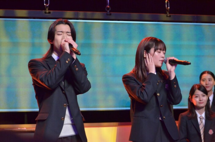 生徒による「一芸発表会」は、吉柳咲良、森愁斗、渡辺色、青山凌大、大塚萌香、白倉碧空によるMrs.GREEN APPLE「点描の歌」の歌唱披露で幕開け。森は「珍しく僕も緊張してるんですけど……すみません、嘘です」と場を和ませ、6人で美しいハーモニーを響かせた。