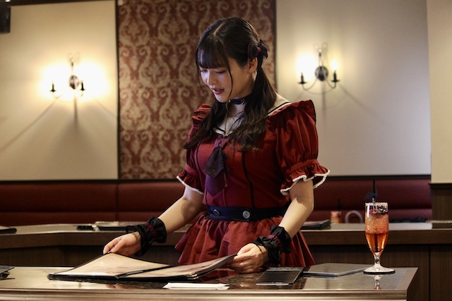 魔界と人間界を隔てる扉を開けると、そこにはヴァンパイア候補生たちが「おかえりなさいませ、先輩」とお出迎え。候補生からカフェのシステムについての説明を受け、オリジナルカクテルである「ブラッティキッス」と「トワイライトガーデン」、そして「満月(フルムーン)オムライス」を頼み終えたところで上坂が登場。「トワイライトルージュのプロデューサーとして生徒会長を務めております、上坂すみれです!」と挨拶し、我々に乾杯の儀式を教えてくれた。