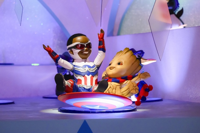愛くるしい姿と言動で人気を集めるグルートが、マーベル・スタジオの映画に登場する仲間たちと地球でバケーションを過ごしている様子を、ボートに乗って一緒に楽しむことができる本アトラクション。映像では、早速かわいらしいグルートが登場したかと思いきや、グルートのカチューシャをつけているお茶目な遠藤が登場する。溝端と、互いにマーベルキャラクターの吹き替え声優を務めていることにはしゃぎつつ、ボートに乗っていざ旅へと出発すると、次々と姿を見せるマーベルのキャラクターたちに大興奮。以前より“マーベル好き”を公言しており、「アベンジャーズの中でも一番“キャプテン・アメリカ”が好き」と語っていた溝端は、「グルートいますよ! かわいい~」、「うわ! ハルクだ!」、「あ! マイティ・ソー! 雷落としてます!」とマーベル愛を炸裂させながら、ついに自身で演じることになった新キャプテン・アメリカの姿を発見し「でました! NEWキャプテン! すげー!」「キャプテンの盾がありますよ!」と目を輝かせ大興奮。さらに遠藤も「(グルート)あそこにもいた!」「またいた!」と、いたるところで登場するグルートを発見し、かわいい姿を見せた。