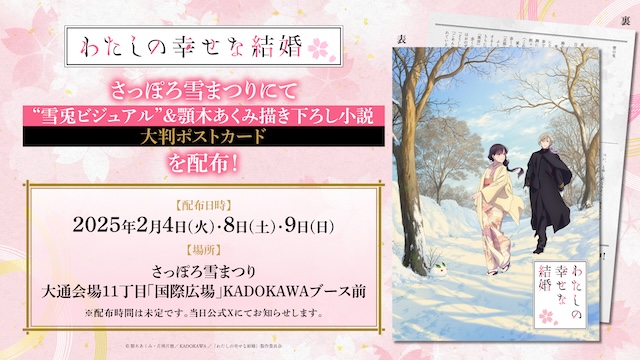 また、さっぽろ雪まつり会場にてアニメ『わたしの幸せな結婚』商品の販売が決定。カドスト、AKIHABARAゲーマーズ本店でも一部商品の取り扱いが決定した。