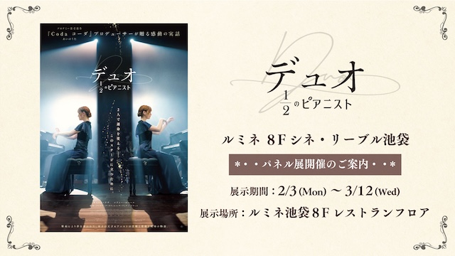 また、2月28日に公開されることを記念し、本作のパネル展が、3月12日までルミネ池袋8Fで開催中。会場では、主人公のクレールとジャンヌが寄り添ってピアノを弾く新ビジュアル含め、本作の世界を存分に味わえる数々の場面写真や映像などが展示される。さらに、本作のオフィシャルサポーターを務める石丸幹二のナレー ションが店内放送も聞くことができる。