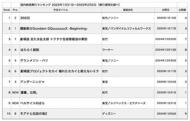 2月第1週の動員ランキングは、公開4週目にして『366日』が遂に初の1位に躍り出た。6位に初登場した後、5位、2位と着実にランクアップを果たしてきた同作。週末3日間の動員は18万1000人、興収は2億2500万円。公開から24日間の累計動員は106万8400人、累計興収13億7200万円。特定の過去のヒット曲をモチーフにした映画のヒットとしては、過去に『ハナミズキ』(2010年公開。興収28.3億円)、『糸』(2020年公開。興収22.7億円)などがあるが、いずれも時間をかけて幅広い年齢層の観客にも広がっていった作品という共通点があり、『366日』のヒットも「10〜20代の女性客」「ソーシャルメディアで話題」といったこれまでのキーワードだけでは語れない段階に入ってきた。