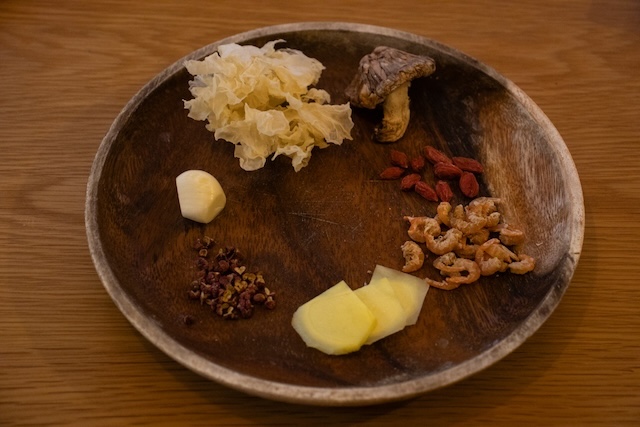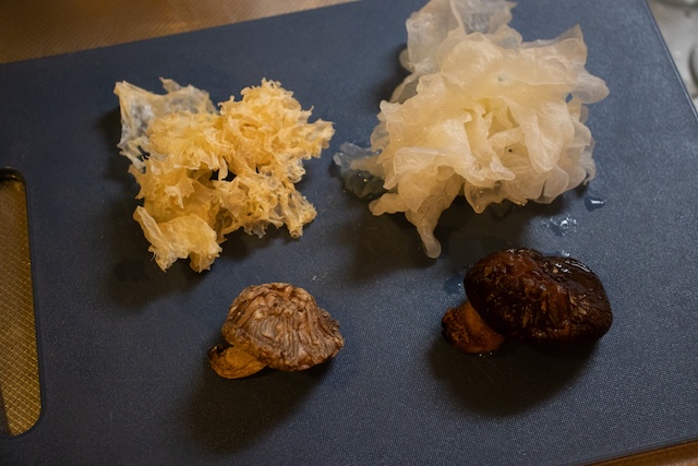 スープを煮出している間に、次の工程へと移る。乾燥白きくらげと干しエビを別々の器に入れ、たっぷりの水に浸して戻していく。どちらも室温で30分ほど置くのだが、ここで乾燥白きくらげと事前に準備していた乾燥しいたけを並べてみると、それぞれそのサイズ差に驚かされる。特に白きくらげは乾燥時の見た目に騙されて、入れすぎないよう要注意。一方、干しエビは意外にも乾燥前後でそれほどサイズに変化がなかった。