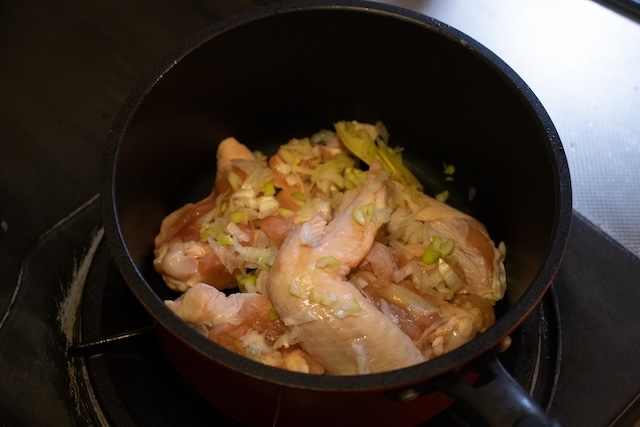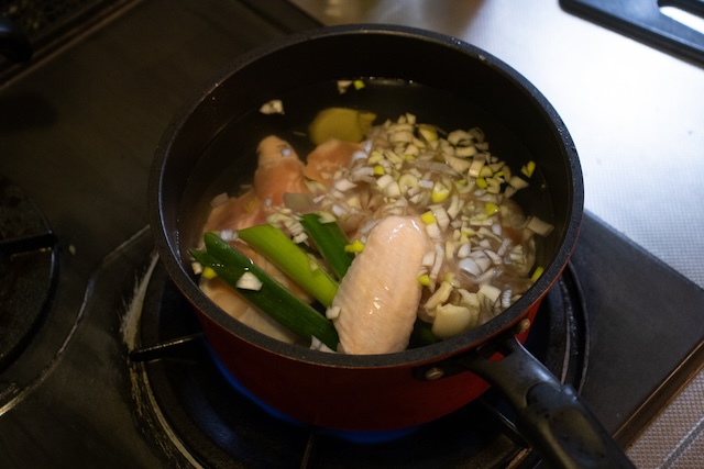 鍋がぐつぐつと沸騰し始め、表面にアクが浮かび上がってきたら、丁寧に小まめにすくい取って捨てていく。アクを綺麗に除去できたら、火加減を中火よりの弱火に調整し、ふたはせずにそのまま30分ほど煮出していく。火加減の絶妙な目安は、湯面にぽこぽこと小さな泡が立ち、鍋の中の鶏肉がゆるやかに揺れ動くくらい、とのこと。