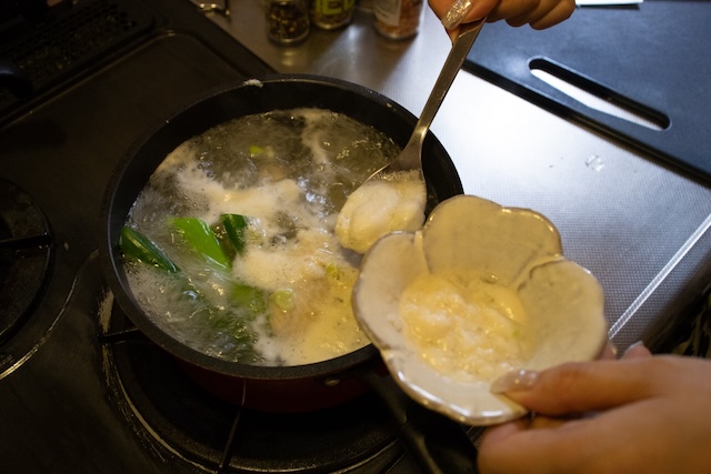 ここで恥ずかしい告白をせねばならないが、筆者はうっかりとみじん切りにした白い部分のネギまでこの段階で鍋に放り込んでしまうという初歩的ミスを犯した。皆さんはどうか同じ過ちを繰り返さぬよう、レシピの手順をしっかり確認してほしい。