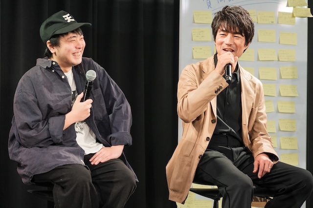 会場の雰囲気も温まったところで、仲村と近藤監督が登場し、第二部・トークセッションがスタート。最初に、登壇前に実食したハンバーグの味の感想を求められると、二人とも「想像以上においしかったです」と回答。第一部でファンがハンバーグを食べている間に、仲村と近藤監督も控え室で同じものを食べていたのだ。