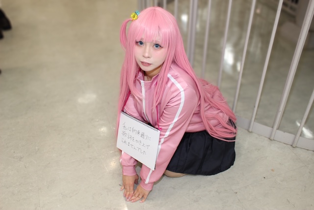 アコスタで『ぼっち・ざ・ろっく!』の主人公・後藤ひとりに扮していたのは、普段は接客業をしているコスプレイヤーのはちみつ。コスプレのポイントは、作中で後藤ひとりが掲げる「私は約束通りに歌詞を書き上げられませんでした」のプラカードと、ぴょんと飛び出したアホ毛を挙げてくれた。さらに、作品の魅力を尋ねると、「陰キャで心が痛くなるくらい友だちがいないキャラクターなのに、ステージに立った時のギャップに感動して。そんなぼっちちゃんの姿を見て自分でもギターも始めちゃいました」と『ぼっち・ざ・ろっく!』から受けた影響も明かしてくれた。