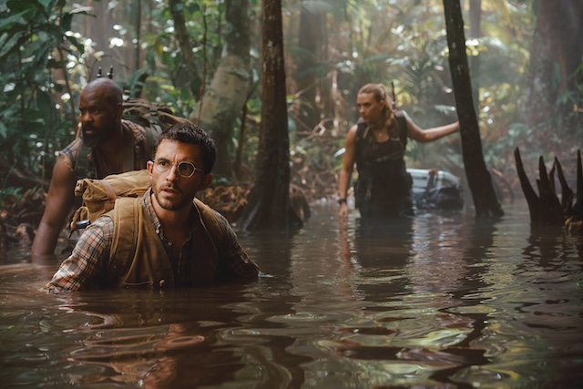 8点の場面写真では、禁断の島に足を踏み入れたゾーラたちが恐竜たちに襲われる緊迫した瞬間が。茂みの中で銃を構え、恐竜のDNAを狙うゾーラをはじめ、川を注意深く進むゾーラ一行の緊張感漂うシーン、巣の中で見つけた卵からDNAを採取する場面や、肉食恐竜のT-レックスが牙を剥き出しに迫ってくる圧倒的な瞬間、さらには海中から現れたスピノサウルスが獲物を狙って勢いよく噛みつこうとする様子が切り取られている。