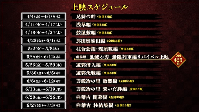 だが、筆者が今回の『鬼滅の刃』の劇場施策で一番驚いたのは、4月4日から始まる『鬼滅シアター - 「鬼滅の刃」特別編集版 劇場上映-』だ。これは、同作のテレビシリーズ「竈門炭治郎 立志編」から「柱稽古編」までの特別編集版で、この「特別編集」がどういう意味か詳細がわからないが(今わかっているのは、新規映像として特別な舞台裏映像を準備中であること)、『鬼滅シアター』の上映一覧を見る限り、これまでのテレビシリーズのほとんどのエピソードを上映することになってもおかしくない。