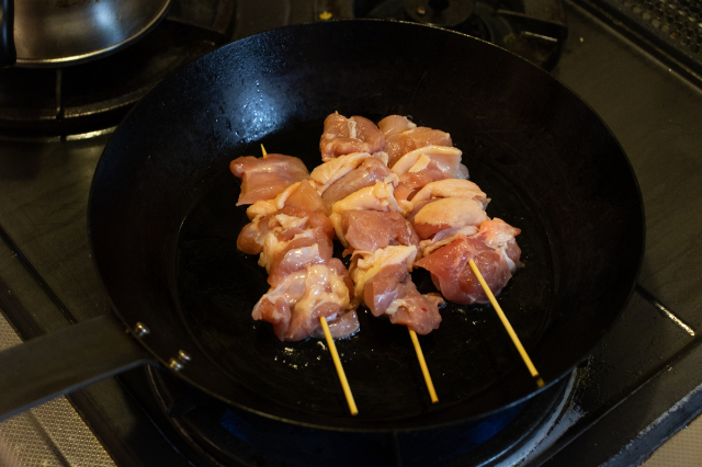 30分経過したらフライパンに油を入れ、中火にして串を並べる。片面を5分焼いたら、裏返してもう片面を5分焼く。焼いている間、串は動かさないことでしっかりと焼き目をつけることができる。