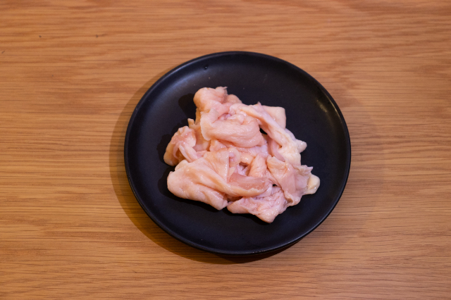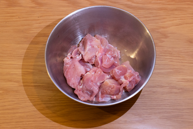 まず、鶏もも肉の皮をはぎ、肉と皮に分ける。鶏もも肉はひと口大にカット。わたしはかぶりつきたかったのでやや大きめにカットしたが、もう少し細かく切って縦に綺麗に串刺ししていくとより原作の雰囲気に寄せられるに違いない。