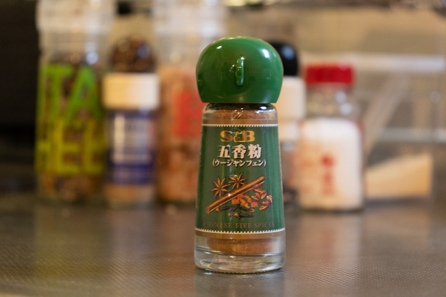 今回、至って普通にどの材料もその辺のスーパーで手に入るが、ひとつ薬屋らしさを味にプラスしてくれたのが「五香粉」だ。中国の代表的な混合スパイスで、文字通り、スターアニスやクローブ、花椒など5種類のスパイスをバランスよくブレンドしているという。