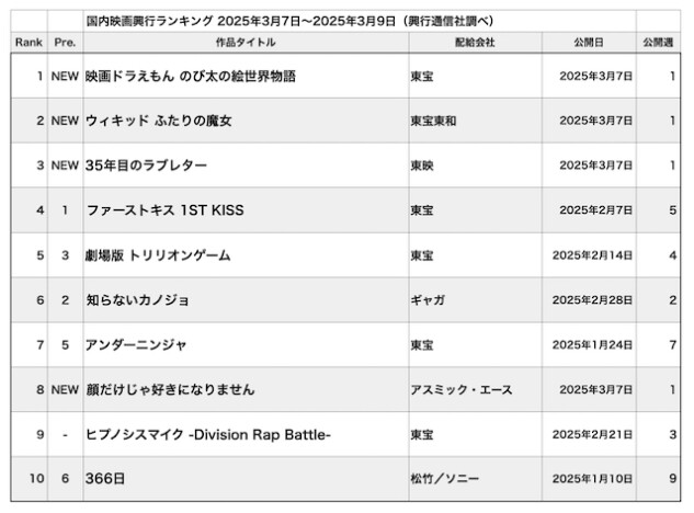 そんな『映画ドラえもん のび太の絵世界物語』に週末成績で肉薄し、まだ子供たちが春休みに入る前ということもあるが、ウィークデイではトップを独走しているのが2位に初登場した『ウィキッド ふたりの魔女』。オープニング3日間の動員は32万1000人、興収は5億1900万円。実写外国映画のオープニング興収が5億円を超えるのは、昨年の『デッドプール&ウルヴァリン』以来約8ヶ月ぶり。『デッドプール&ウルヴァリン』の最終興収は21.2億円に終わったが、スーパーヒーロー映画の常で初動型の興行だった。一方、『ウィキッド ふたりの魔女』は日本で当たればロングヒットになりがちなミュージカル作品。先日授賞式が開催された第97回アカデミー賞では、10部門にノミネートされながら、衣装部門、美術デザイン部門の2部門受賞にとどまったが、作品評価も極めて高いだけに、実写外国映画としては久々の興収30億円超えも狙える好スタートだ。