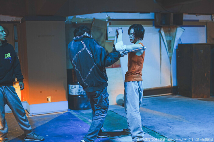 撮影が行われたのは千葉県某所。裏社会の組織が拠点とする廃墟で、組織を裏切った神田が両手を縄で縛られ、黒部(カトウシンスケ)からいたぶられているシーンの撮影に立ち会った。上半身は何も身にまとわず、下着だけを身に着けた神田と、カップに入った麺をすすりながらも、非情に部下に指示を出す黒部の姿からは、単に暴力だけが存在するのではなく、黒部のフェティッシュな執着や欲望が感じられるようなシーンになっていた。