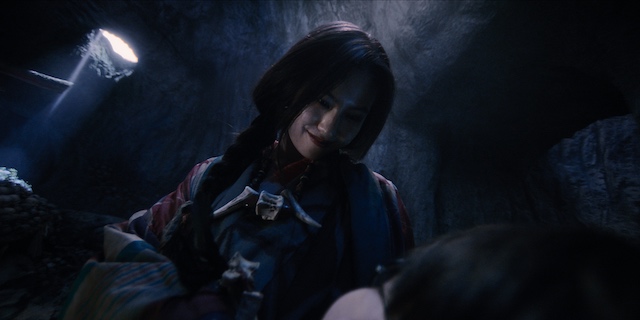 その言葉通り、森の奥深くで生きていた銀。その傍には、まだ小さな彼女の息子・白銀(しろがね)の姿もある。捕まったもう一人の村人は彼女の毒牙にかけられており、完全に狂ったかのような銀のおぞましい姿と、真っ白な雪と鮮血のコントラスト。オープニングからかなり攻めたシーンで幕を開けた今回は、現代までつづく供花村と後藤家の関係性がはっきりと明らかにされるエピソードとなる。そのカギを握る存在が、前回のラストで銀の前に現れた“カシハベ”という山賊たちである。