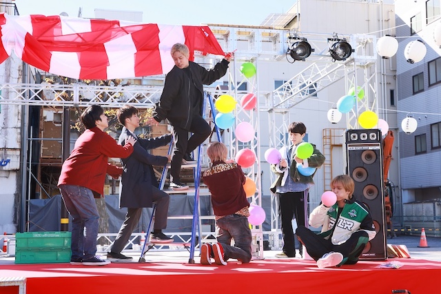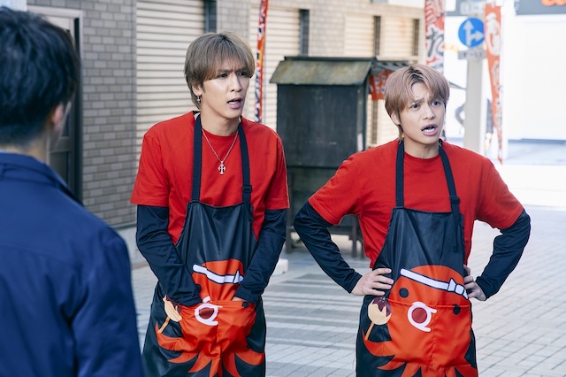 公開されたのは8点の新場面写真。阿川建設の裏社員・宴(桐山照史)、宝田(神山智洋)、詳敷(濵田崇裕)が「うたげや」の店員に扮する姿や、ライバル関係にある川端建設の裏社員・ジン(中間淳太)とチャラ(藤井流星)がたこ焼き屋のエプロンを身に着け、阿川建設の3人へ睨みをきかせ突撃するシーンなどが切り取られている。